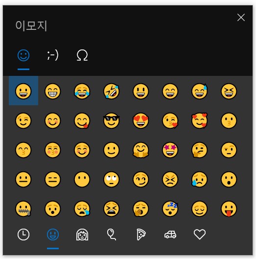 Windows 10 운영체제의 최근 버전에서는 윈도우 키(Win)와 마침표(.)를 함께 누르면 다양한 텍스트형 이모티콘을 사용할 수 있습니다. 방법2에서의 터치키보드 방법과 유사하게 창을 켰다가 끄면 문제가 해결됩니다.