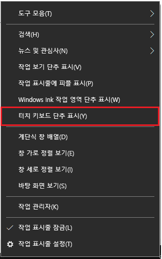 그럼 아래와 같이 다양한 도구가 표시될 텐데 이 중 터치 키보드 단추 표시를 눌러줍니다.