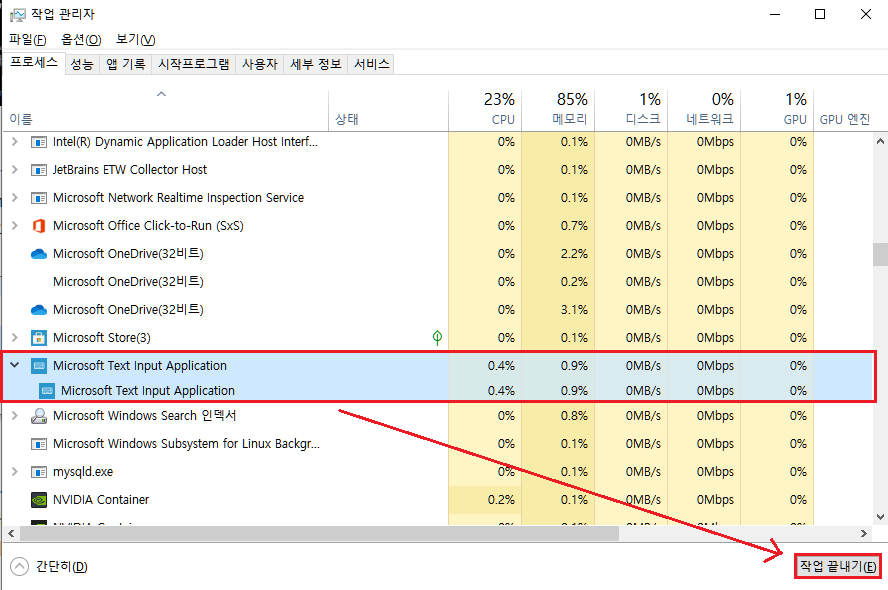 작업을 찾았다면 한번 클릭해서 선택해 준 뒤 작업 끝내기 버튼을 클릭해서 종료해 줍니다.